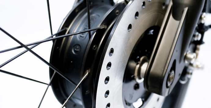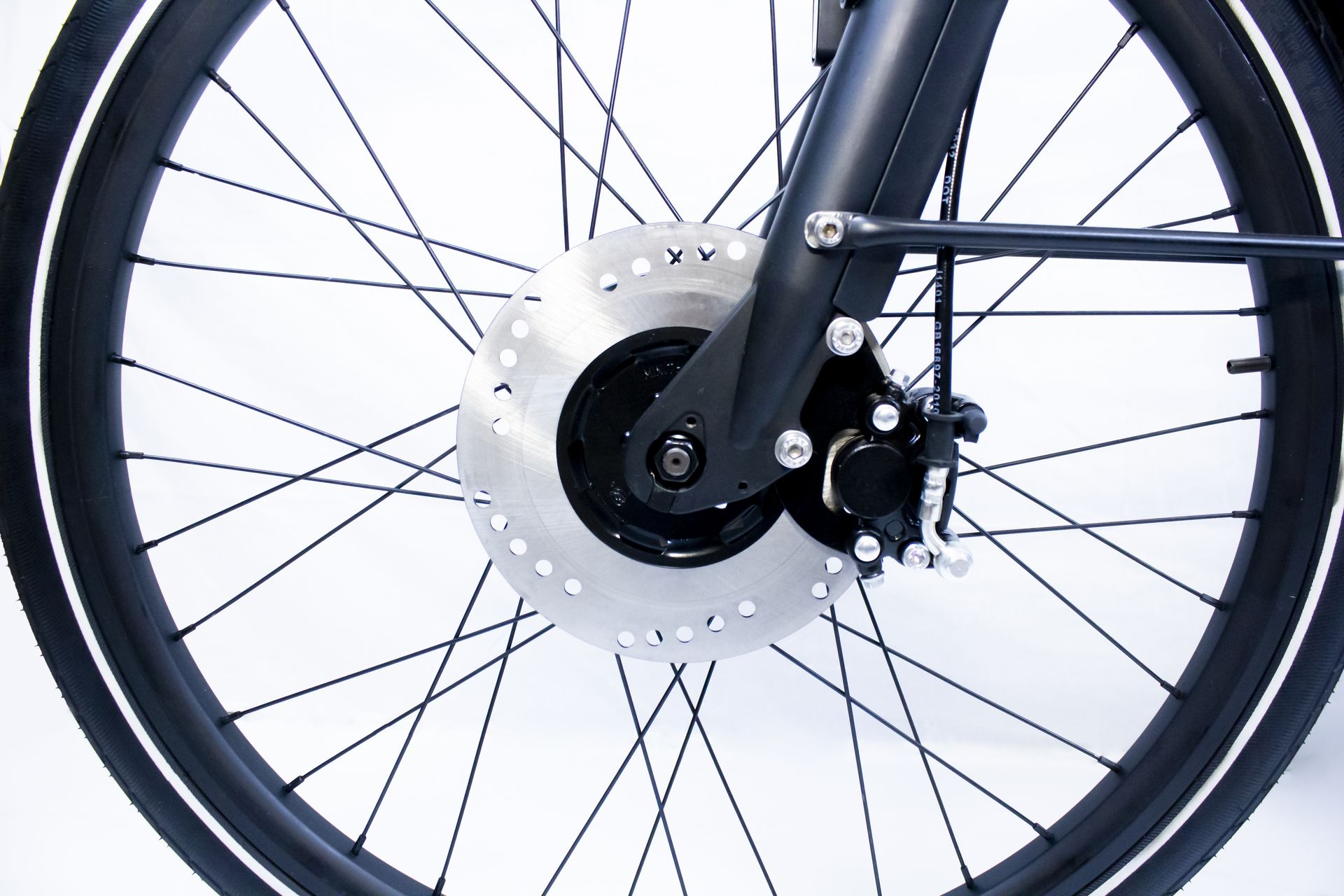 Veilig hydraulisch remmen met minimale slijtage, door speciaal ontworpen remschijven en remblokken, afgeleid van scooter-rem.